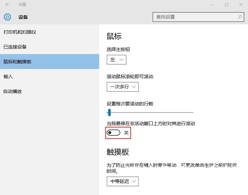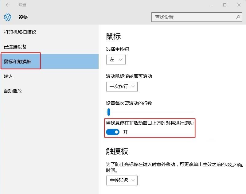 3、在设备选项卡的左边栏找到【鼠标和触摸板】,并点击进入,同时可以看到【当我悬停在非活动窗口上时对其进行滚动】,默认值为开启。