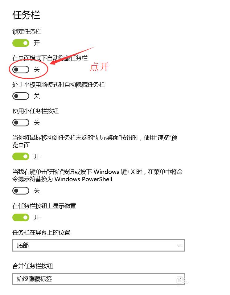 6、找到“在桌面模式下自动隐藏任务栏”方案,点击打开,此外我们还可以看到任务栏其他的个性化设置,设置属于自己的个性化设置