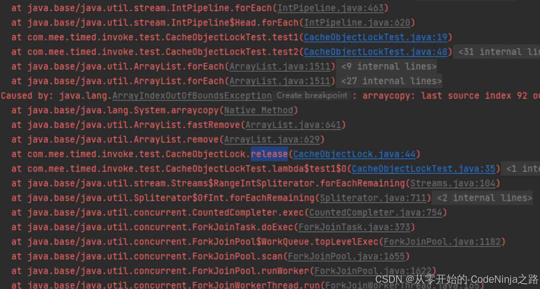 开始一直到 lock.release(i) 这中间是没有加同步锁的,所以到 lock.lock(i) 开始一直到 lock.release(i) 这中间是存在线程竞争的,恰好又碰到 arraylist 这一不安全因素自然会抛错的!