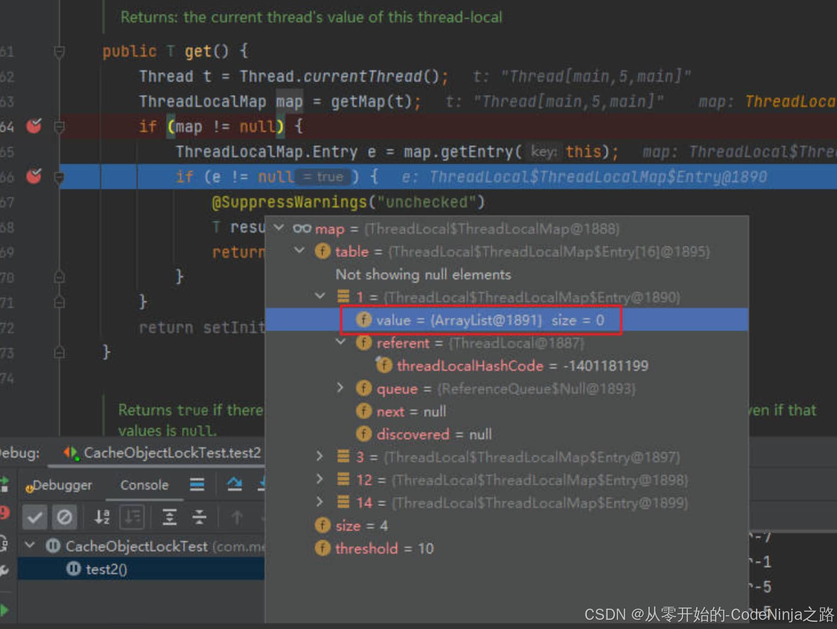 在这一行打上断点 lock.contains(9); 然后逐步进入到 threadlocal 的 get() 方法中: