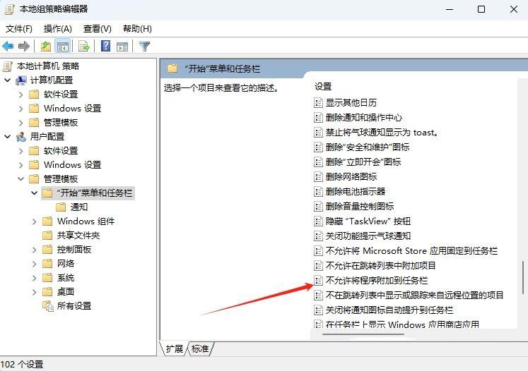 3、然后,找到并双击打开其中的“不允许将程序附加到任务栏”。