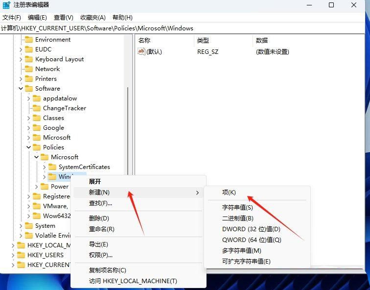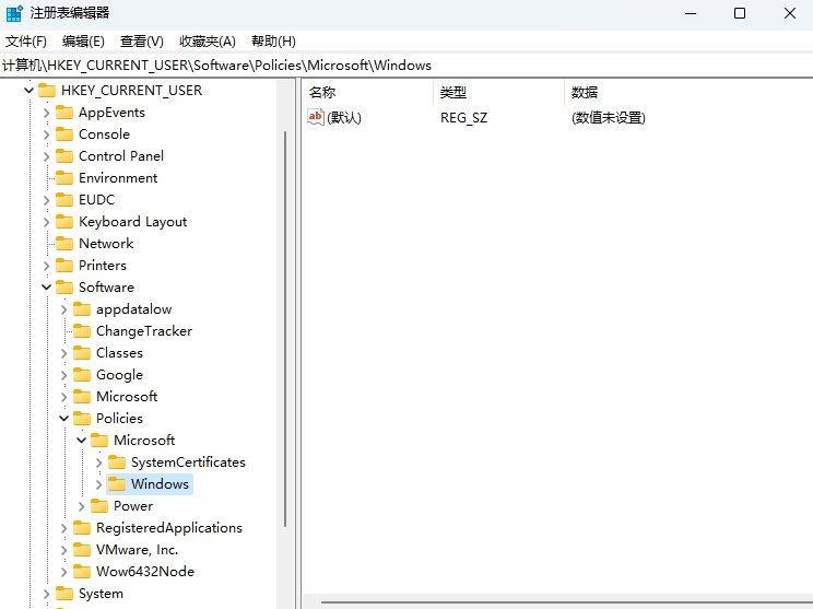 2、接着,在打开的界面中,依次点击展开“hkey_current_user\software\policies\microsoft\windows”。
