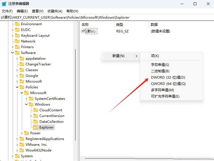 4、随后,在其对应的右侧界面中,右键点击空白处,选择新建一个“dword(32 位)”值。