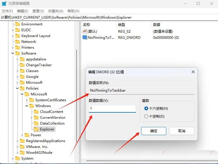 5、紧接着,将其命名为“nopinningtotaskbar”,再双击打开修改“数值数据”值为“1”,点击确定即可。