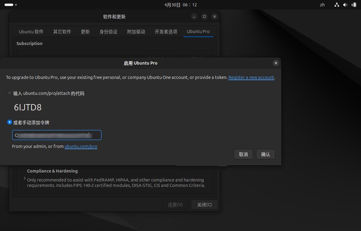 3、访问 ubuntu pro dashboard 拿到分配给你的token,填入「手动添加令牌」中,然后点击「确定」。