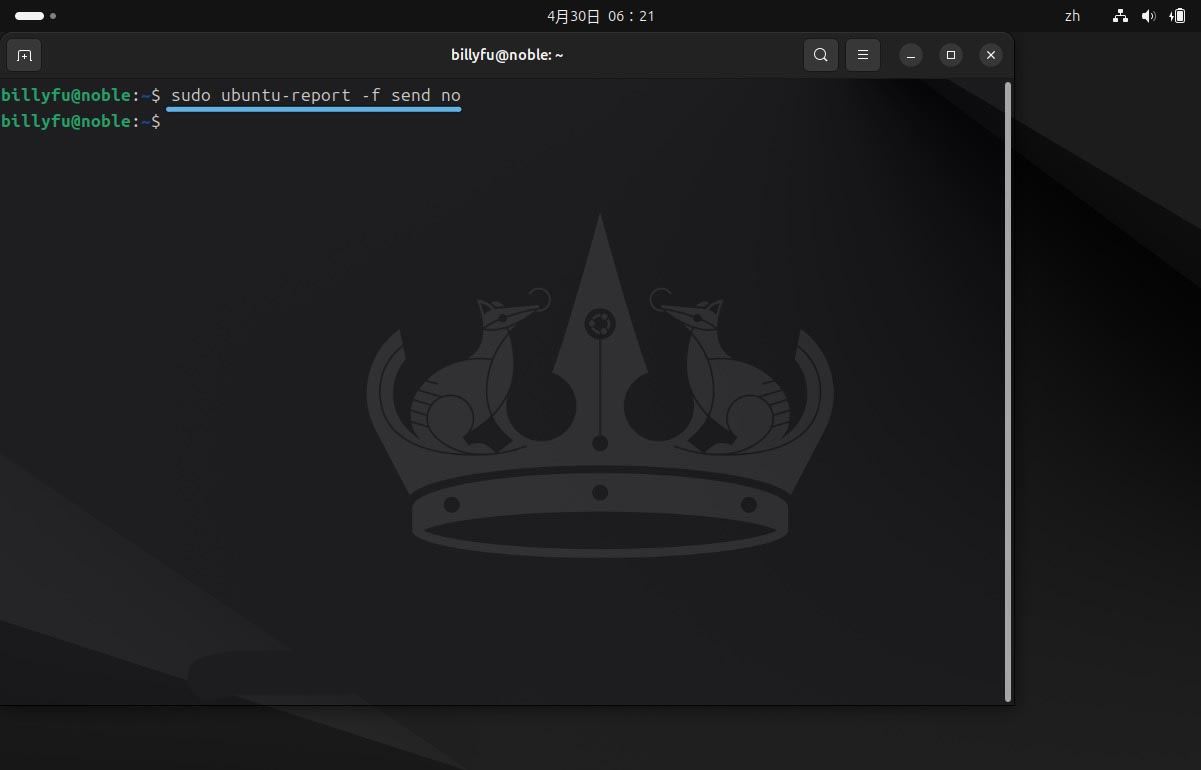 默认情况下,ubuntu 24.04 lts 会启用后台数据报告功能,而且没有提供用户界面选项来禁用它。你可以打开「终端」并运行以下命令来关闭后台数据报告: