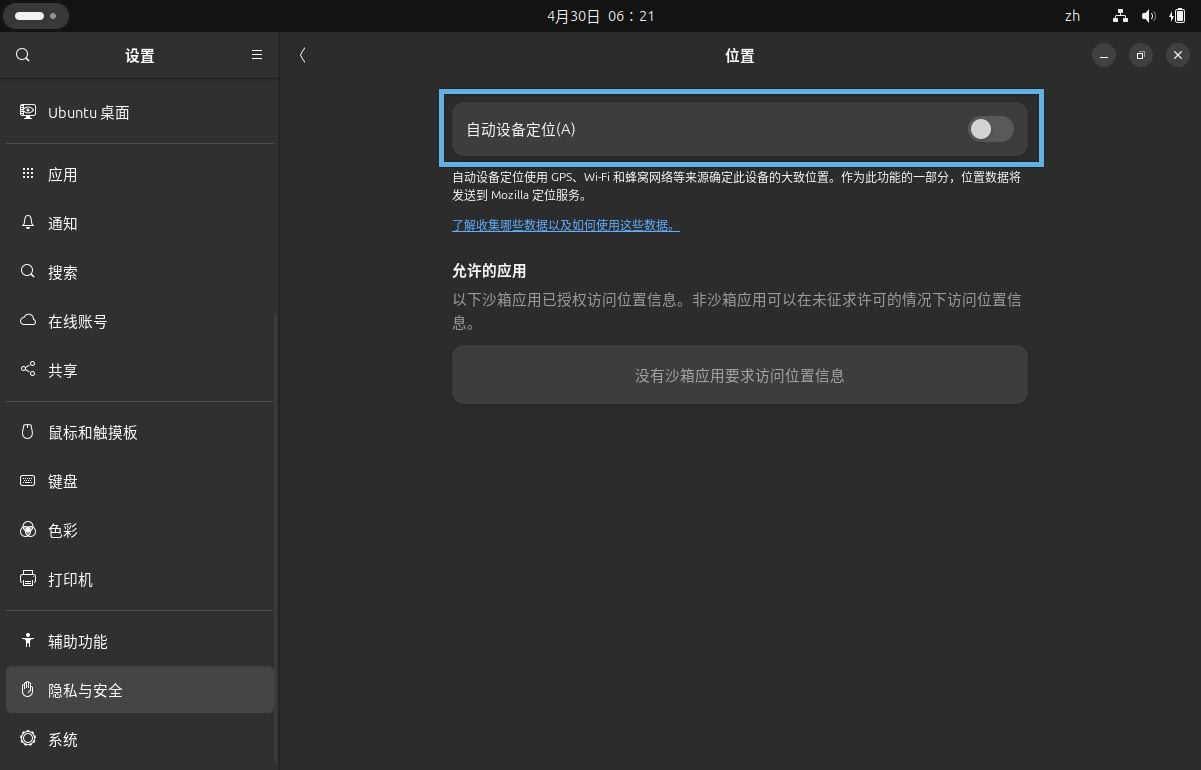 关闭 ubuntu 24.04 lts 自动设备定位