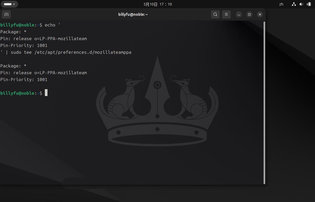 4、设置 mozilla ppa 优先级,确保总是优先选择 mozilla 的 deb 版本: