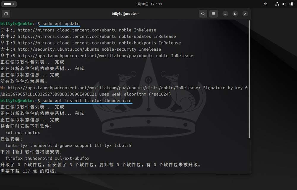 5、刷新软件仓库并安装 firefox 和 thunderbird 的 deb 版本: