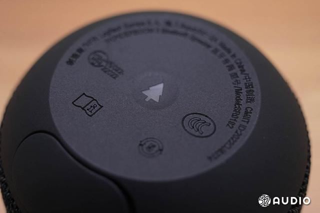 音箱顶部的三个按键,从左至右以此为开关机、播放暂停和配对按键。其中内凹的开关按键上设计有条状白灯。