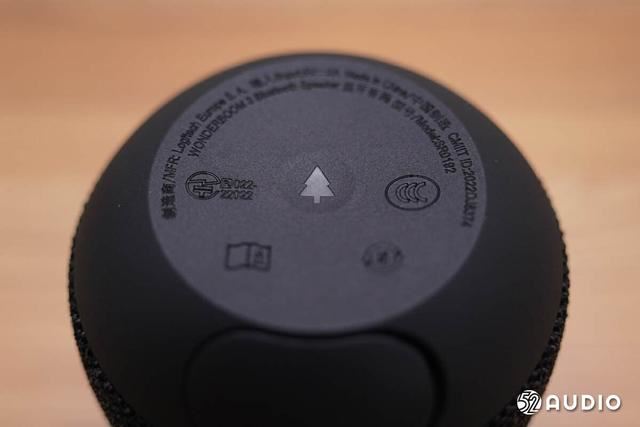 音箱底面,标记了制造商、输入电压电流、产品类型、监管等信息。正中间圣诞树为户外扩音开关按钮,开启后亮起白灯。