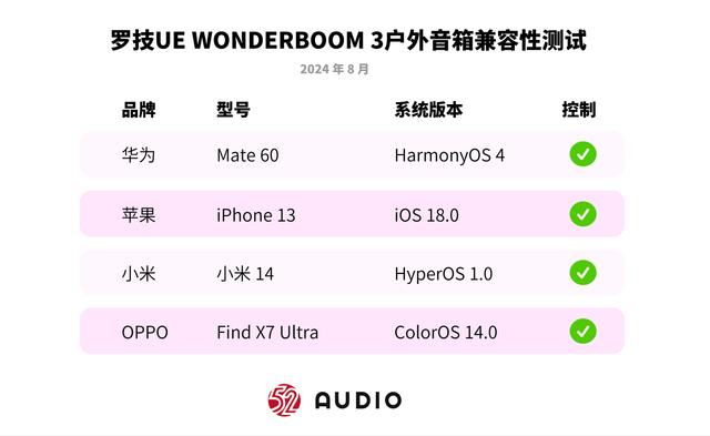 没错,罗技ue wonderboom 3仅支持了老版本的蓝牙4.0连接,我们使用主流品牌手机进行连接测试,下图为我们在其在兼容性上实际表现。