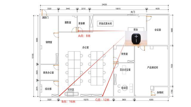 我们将罗技ue wonderboom 3与手机连接,并将手机固定在我们编辑部前台,佩携音箱分别走到 a、b、c 三点,以此测试耳机的连接稳定性和抗干扰性能。其中: