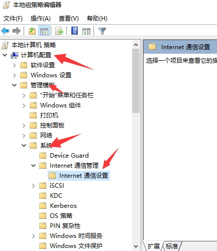 2、进入到本地组策略编辑器后,依次点击左侧栏中的"计算机配置——管理模板——系统——internet通信管理——internet通信设置"选项。