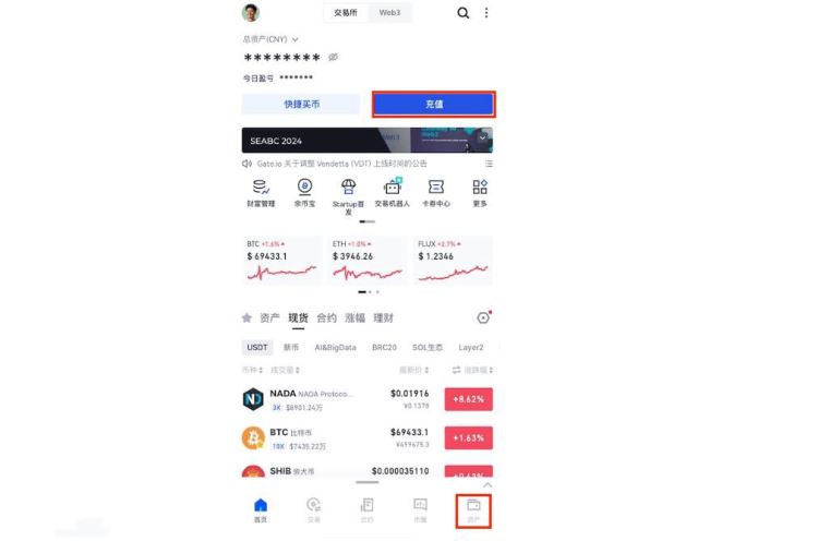 1、在gate.io app登陆账号(点此注册),然后点击主页中的“充值”,或者“资产”。