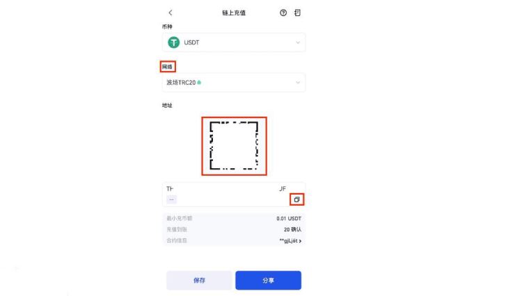 4、选择充值网络,然后复制充值地址或者保存充值二维码。注意:所选择的充值网络必须与提现过来的钱包/平台所选择网络一致,以及合约地址相同,否则不能够到账。