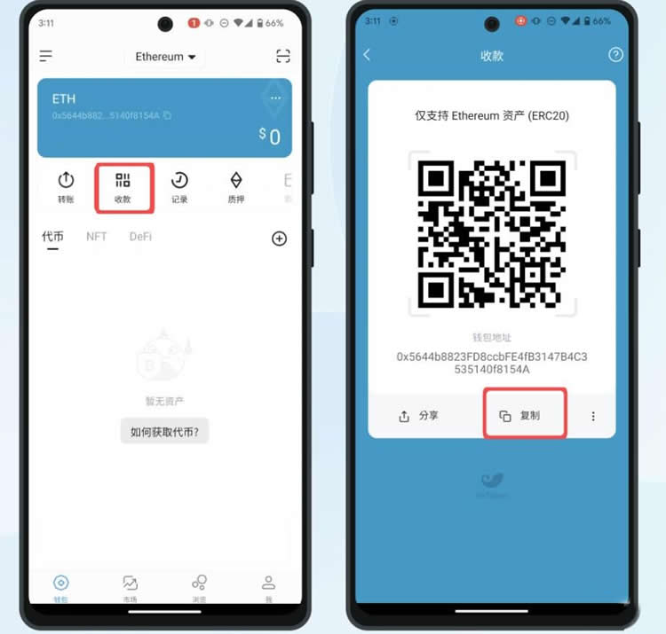 2、如需复制收款地址,可以在imtoken内打开用于收款的钱包,然后点击「收款」-「复制」即可。(下图以复制eth钱包地址为例)
