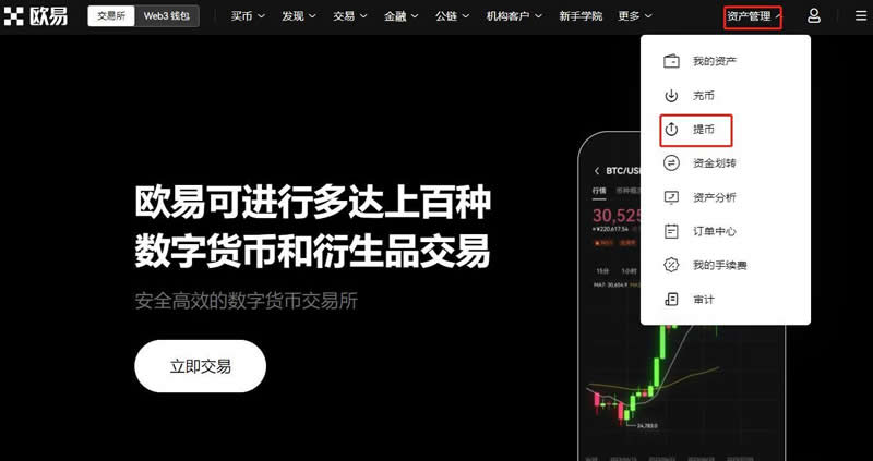 1.打开欧易交易所(点击注册),在首页点击【资产管理】选择【提币】进入提现页面