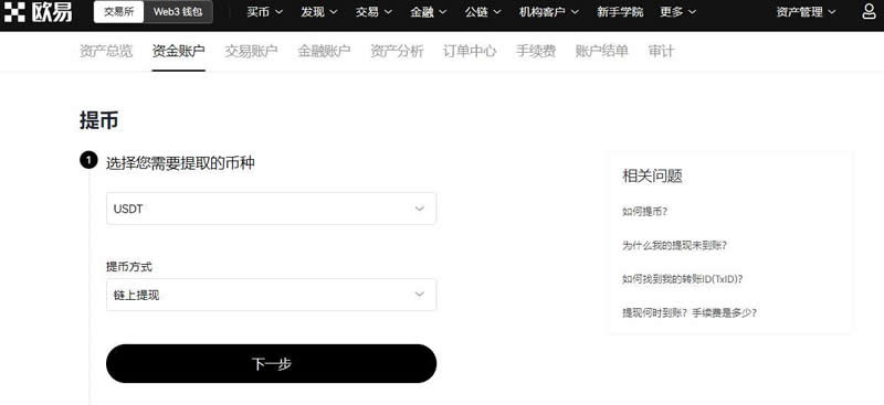 2.在提现页面选择币种【usdt】,提现方式选择【链上提现】点击下一步