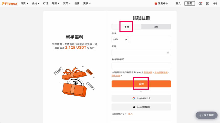 登录派网官网(https://www.pionex.com/zh-cn/signup),请点击上面按钮,立即注册!