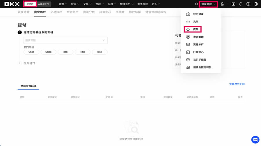 - 进入资金帐户:登入okx后,点击帐户头像旁的「资金管理」,然后选择「提币」。
