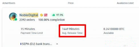 平均放行时间:卖方收到付款后放行加密货币的平均时间。您可点击用户昵称或广告,查看其平均放行间。