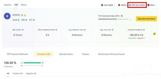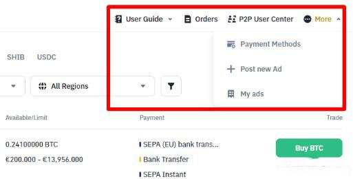 6. 在页面右上角,您可以查看用户指南和 c2c 订单,并访问 c2c 用户中心。您还可管理收款方式和 c2c 广告。