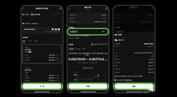 2)以看涨btc为例,根据不同参考年化及期限选择心仪产品,点击【下一步】进入申购页面。输入【申购数量】,点击【申购】,完成【确认】即可申购成功