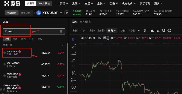 8、在搜索框输入btc,选择btc/usdt交易对,可以看到btc实时行情