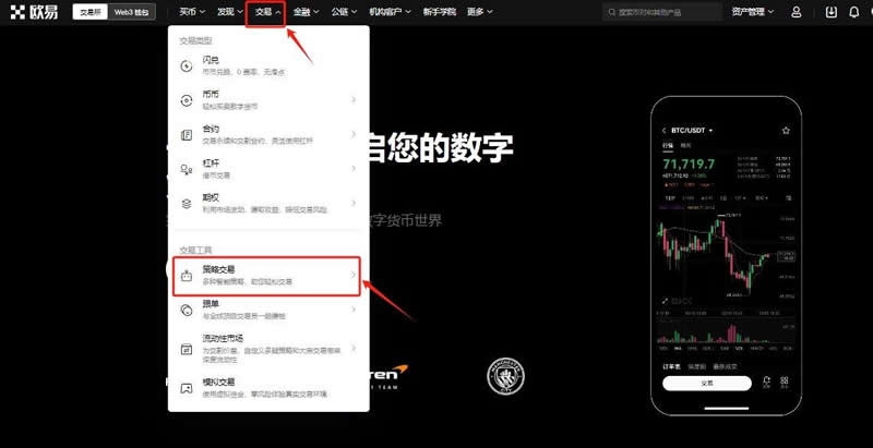 7、进入欧易首页,选择交易页面,点击策略交易模式