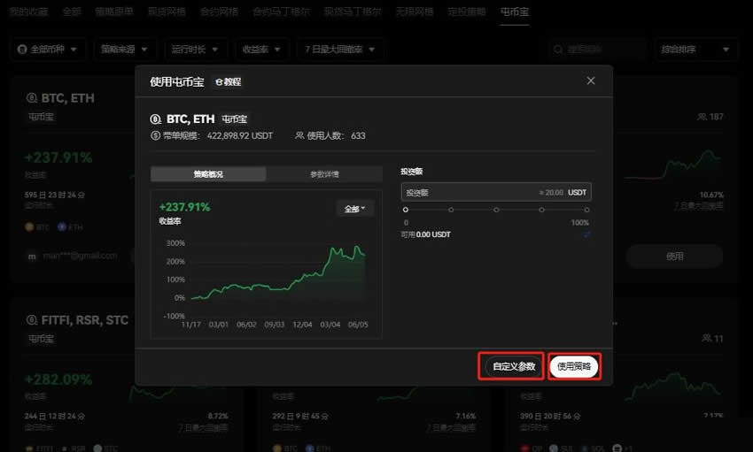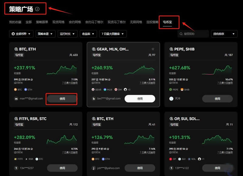 8、进入页面后,滑动到策略广场,选择屯币宝,选择合适的方案点击使用