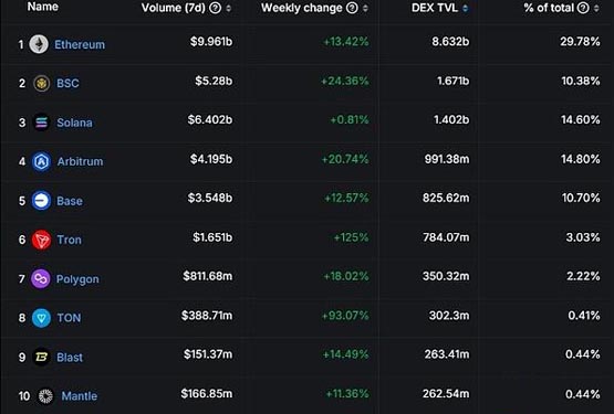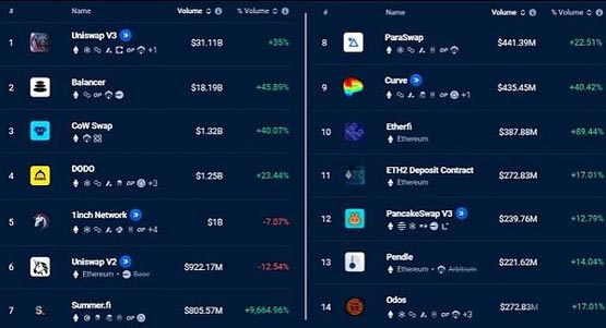 去中心化交易所 7 天交易量,美元。资料来源:defillama