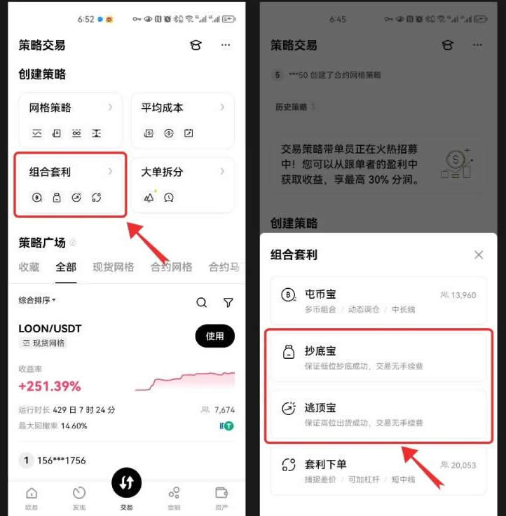 1、打开okx app(点击注册),点击【交易】,选择【策略】,在【组合套利】里选择【抄底宝】/【逃顶宝】
