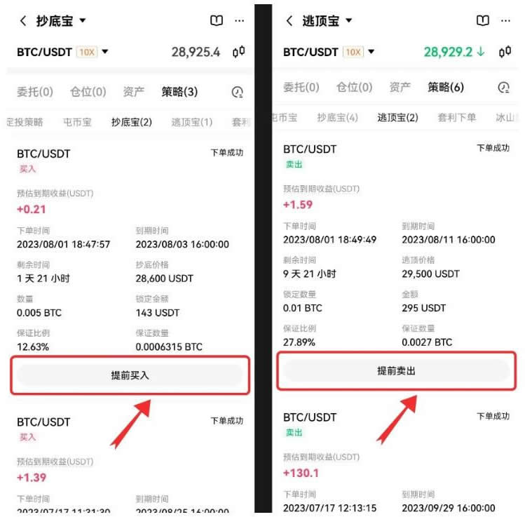 3、提前买入--提前卖出在抄底宝和逃顶宝交割前(下单后24小时,交割前24小时不可操作),允许用户以一定的报价提前完成锁定资金的立即买入或立即卖出(报价由实时行情和平仓费用决定)。