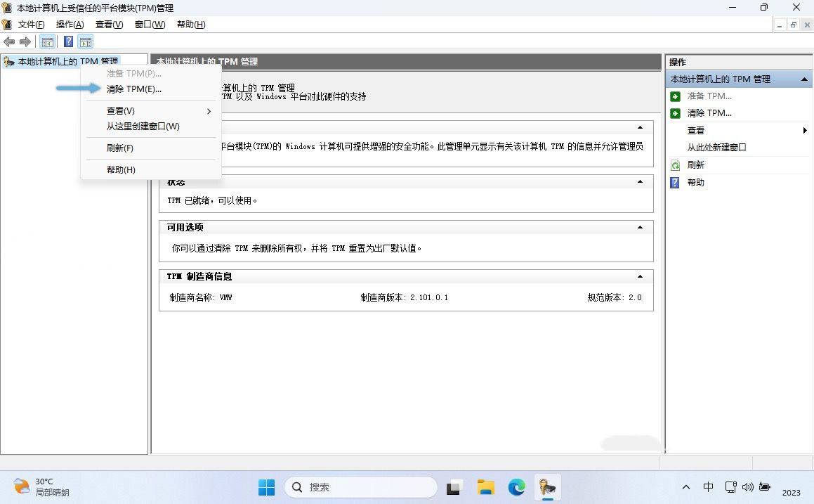 2. 右键点击左侧面板中的「本地计算机上的 tpm 管理」,选择「清除 tpm」选项,再点击「重新启动」选项。