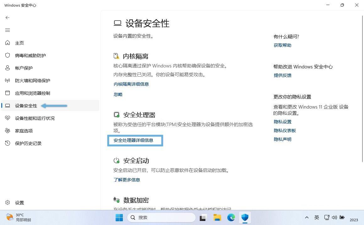1. 在「开始」菜单中搜索并打开「windows 安全中心」,点击左侧面板的「设备安全性」,然后点击右侧面板的「安全处理器详细信息」。