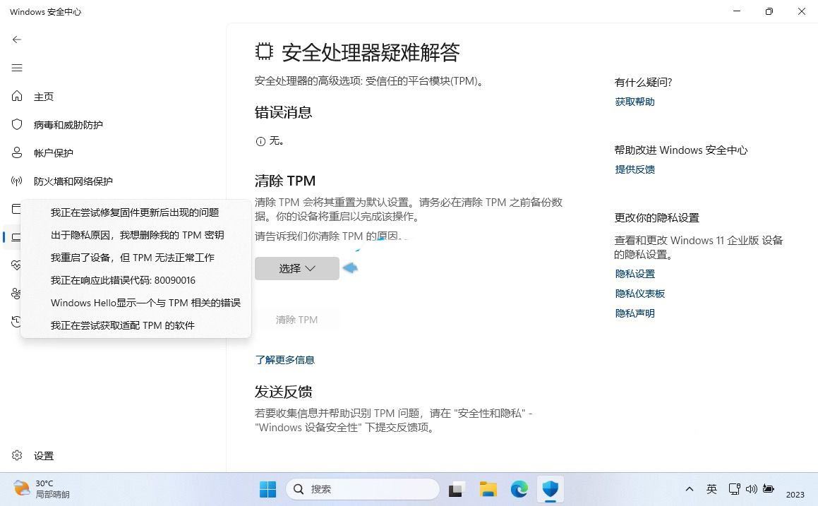 很多计算机的 bios 中都有「安全」选项,也可以通过 bios 重置 tpm 芯片: