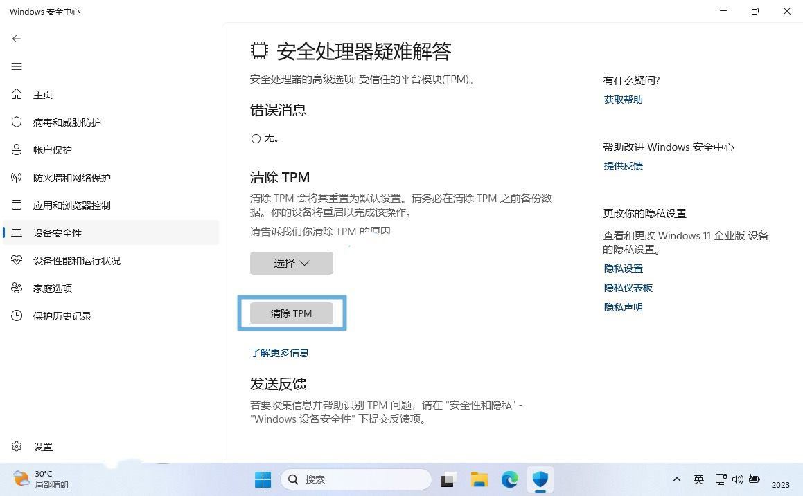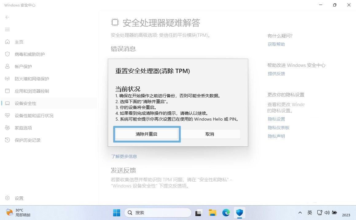 方法 4:通过「windows 安全中心」清除 tpm
