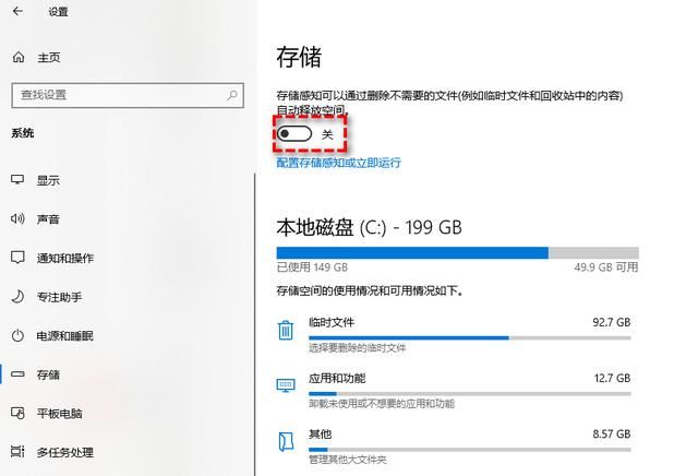 请你依次点击“设置”>“系统”>“存储”,然后启用存储感知功能。