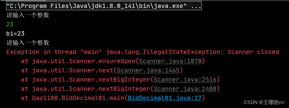 但是注意一旦你关闭后,就算在sc.close()这行代码后你再重新new scanner(system.in),那也不能重新再打开一个扫描器了,如下图发现程序会报错