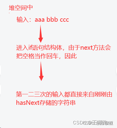 hasnext、hasnextline在返回一个boolean类型结果为true的同时,会在堆空间中开辟一块专门用于存放刚刚输入的字符串,用于下次next或者nextline:即下次next或者nextline不需要再从键盘输入,相当于系统自动把刚刚输入的字符串再原封不动的输入了一遍。同时这个存储寿命=调用对象的寿命。