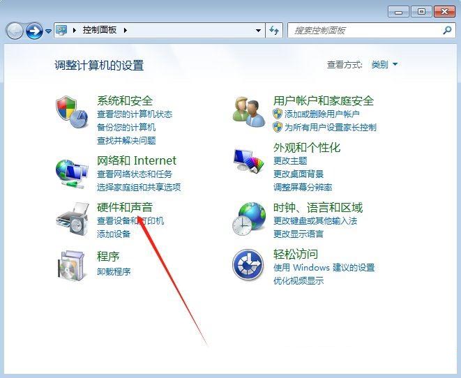 1、首先,打开控制面板界面,点击进入到“硬件和声音”设置。