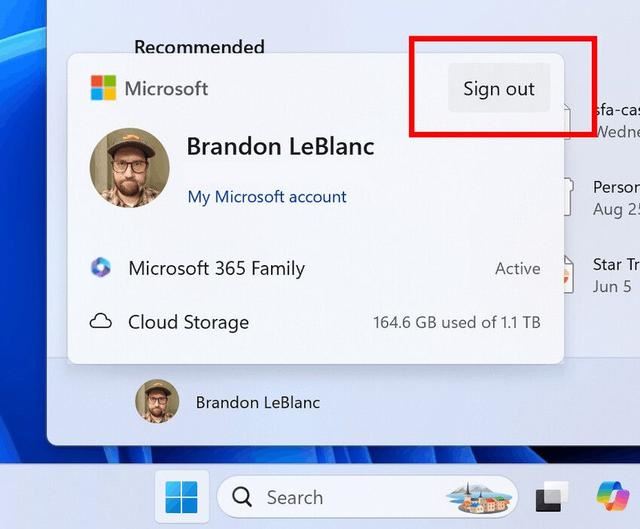 新增功能:用户点击开始菜单之后,账号管理器会出现注销选项。用户要切换到其他用户,请选择省略号(...)。此时会出现其他用户列表,方便切换。