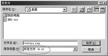 保存此文件,在打开的“另存为”对话框中选择好保存路径,再单击“保存类型”中的下拉箭头选择“所有文件”(一定要选择此步,不然保存后的文件会自动加上txt的扩展名),然后在“文件名”中输入“restore.reg”后按“保存”按钮(如图1)。以后你就可以通过双击这个restore.reg来直接解除禁用注册表的限制。