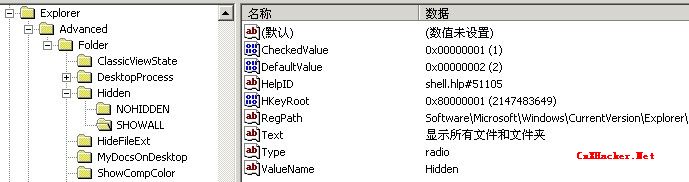 currentversion\explorer\advanced\folder\hidden 它下面有两个项,nohidden和showall ,正常情况下,nohidden下面有个text的字串值“不显示隐藏的文件和文件夹”和一个叫checkedvalue的双字节键,值为0x00000002 (十六进制) ,而showall下面同样有text的键,值为“显示所有文件和文件夹”,checkedvalue的值为0x00000001 。
