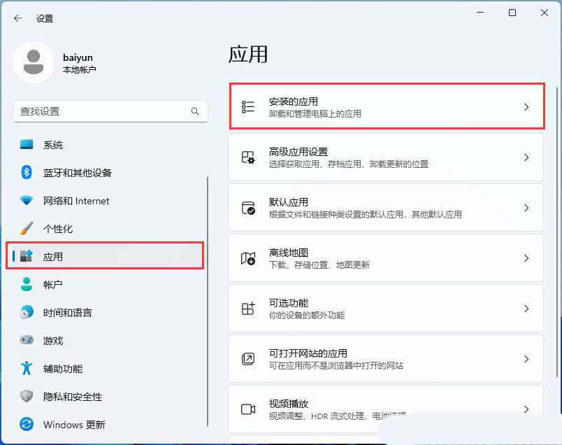 2、设置窗口,左侧点击【应用】,右侧点击【安装的应用(卸载和管理电脑上的应用)】;