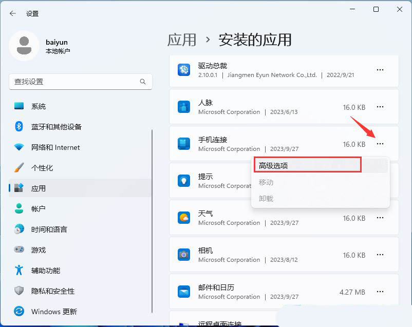 3、使用搜索功能找到【手机连接】,然后点击右侧的几个点,在打开的列表中选择【高级选项】;