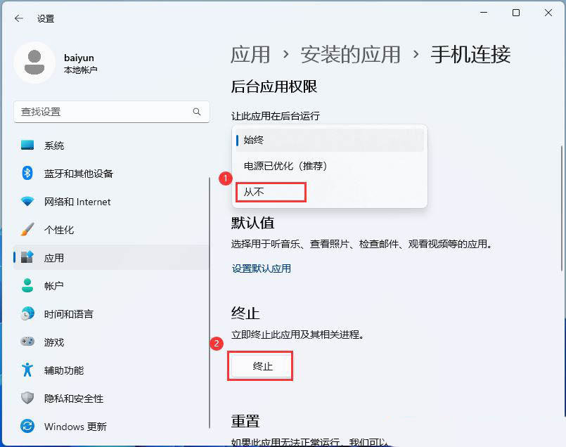 4、将让此应用在后台运行的下拉选项设置为【从不】,这将阻止该应用在后台默默运行。接下来,点击【终止】按钮,立即终止此应用及其相关进程;
