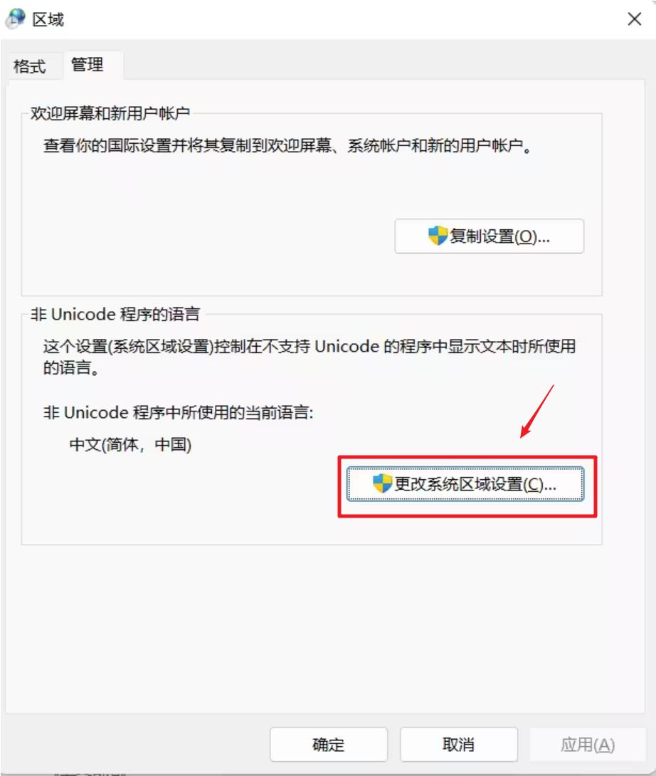 步骤2.在新打开的区域面板中,选择“管理”标签页,点击下方的“更改系统区域设置”按钮