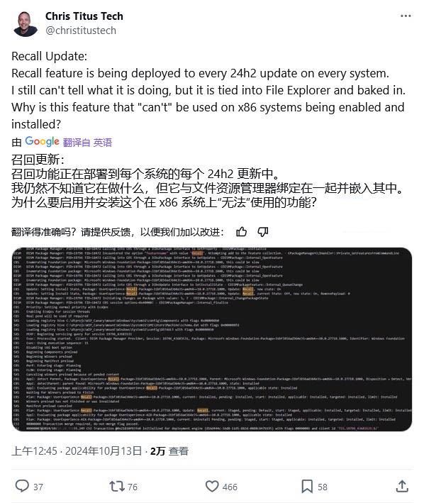youtuber chris titus tech 指出,recall 功能已集成到文件资源管理器中,尝试卸载时会导致 explorer 出现故障。